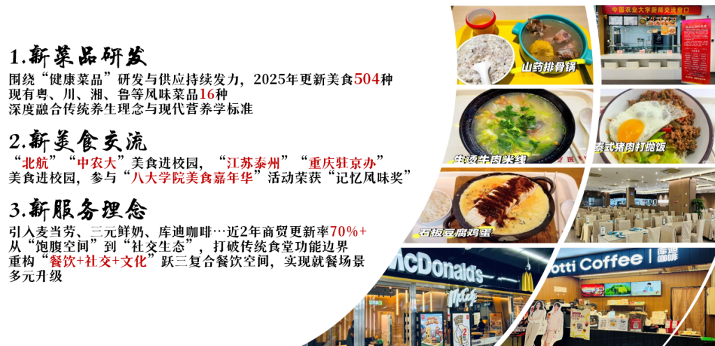 2025年,食堂聚焦新菜品研发、新美食交流、新服务理念“三新”建设。围绕师生需求,引入三元鲜奶、麦当劳、库迪咖啡等商贸服务点,近两年商贸更新率超70%。