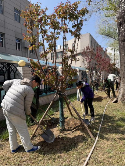 4月10日中午,在病理楼南侧绿地,30余名师生秩序井然,分工协作、热情饱满,挥锹铲土、修筑树堰、培土踩实、浇水,每一道环节都一丝不苟、有条不紊,新栽种的20余棵海棠迎风挺立、错落有致,展现了勃勃生机。