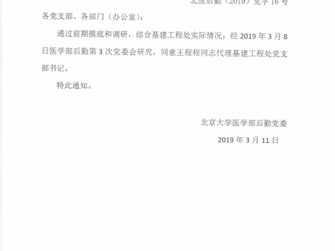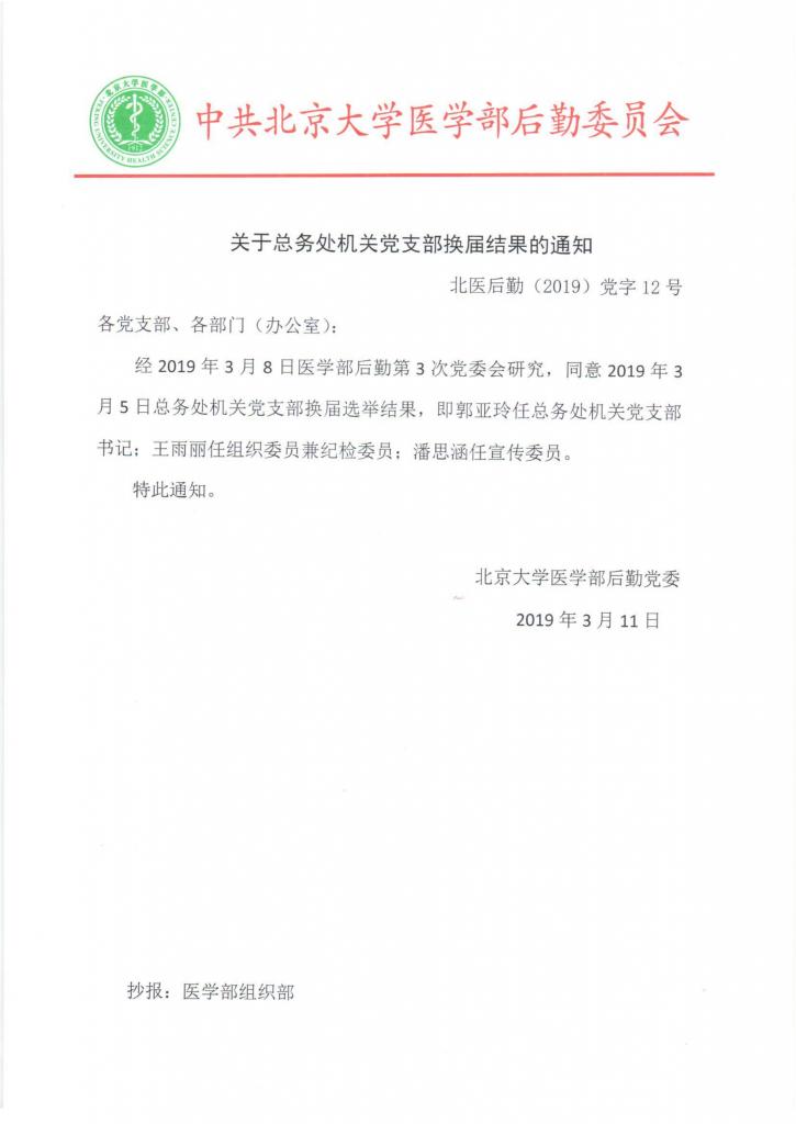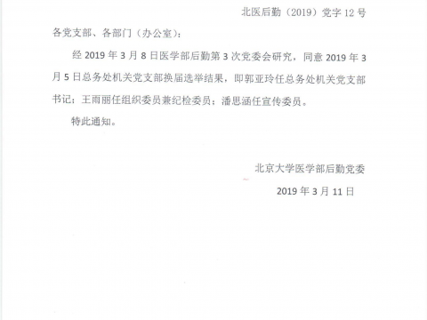 北医后勤(2019)党字10号 各支部、部门: 为